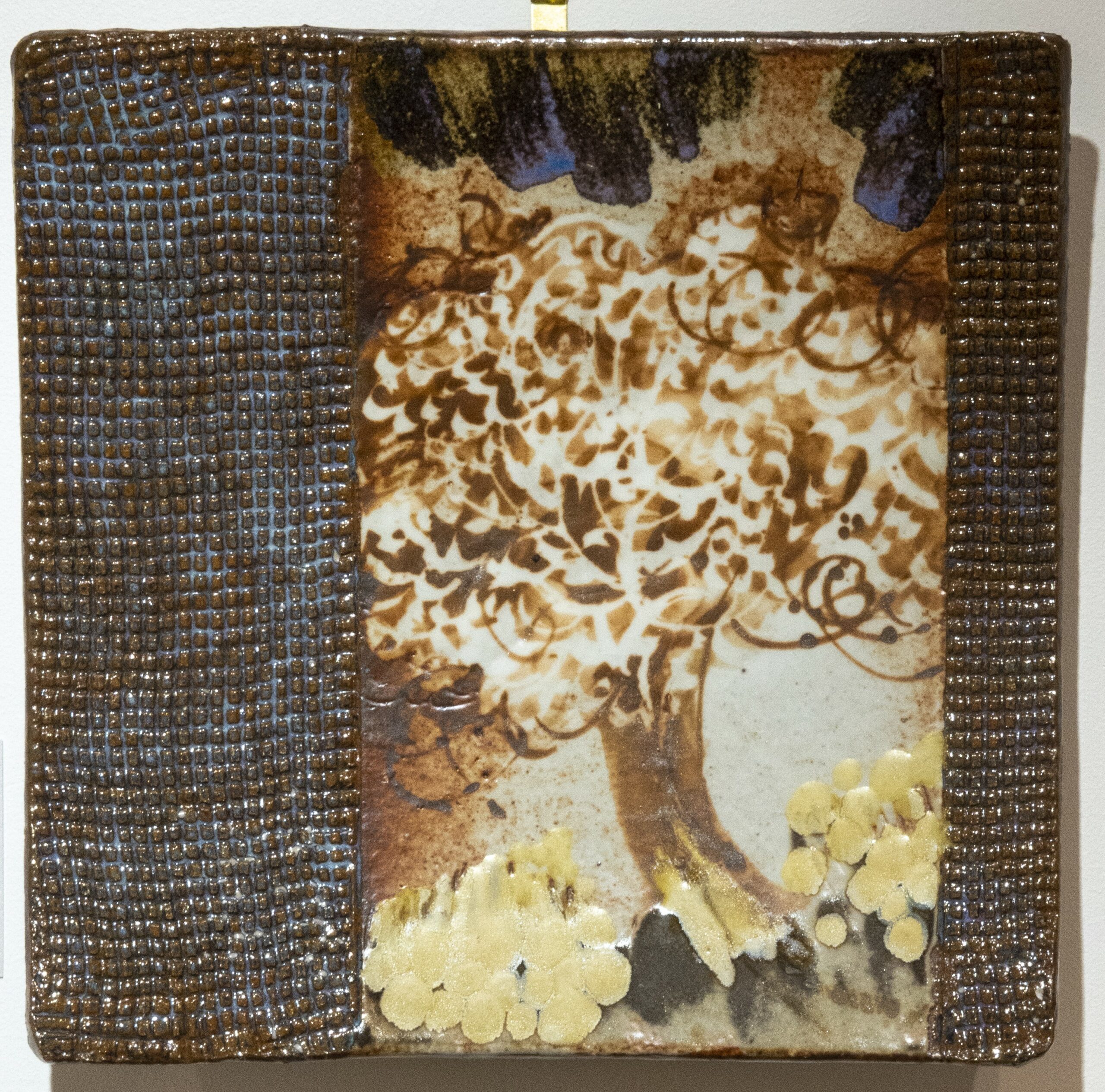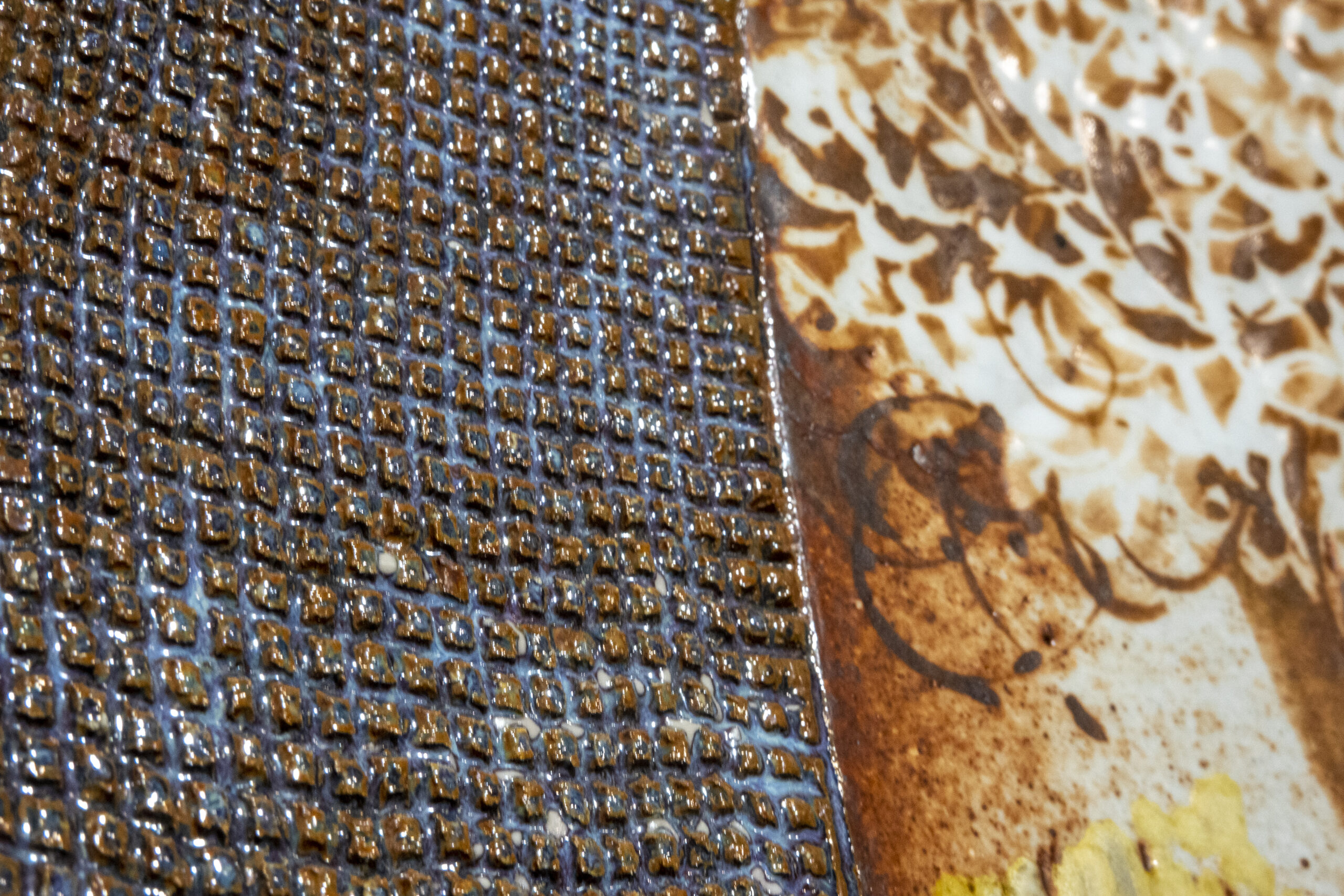 Techniques : Grès chamotté gravé. Emaux superposés et patine. Décors au pinceau. Réserves à la cire.