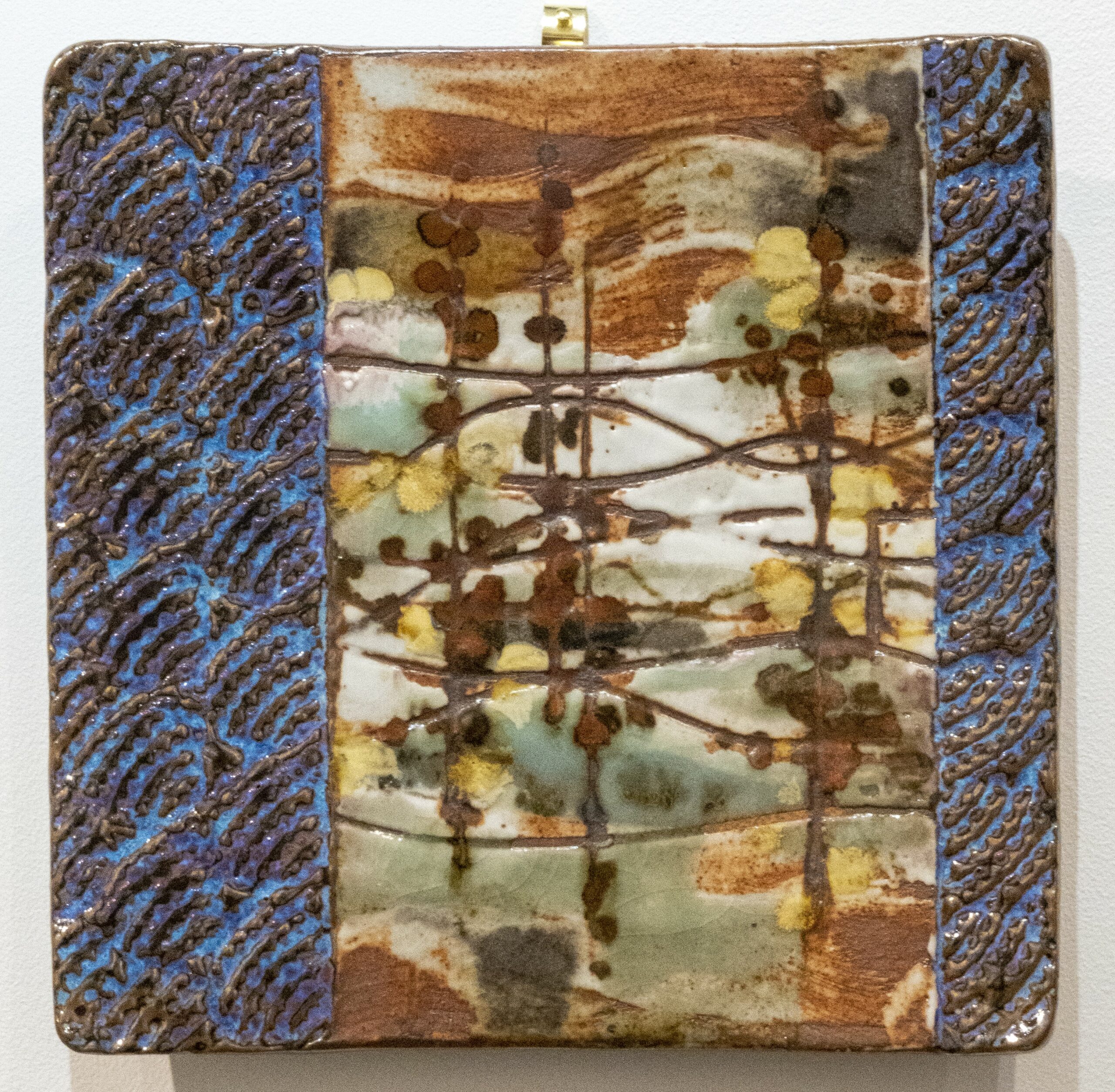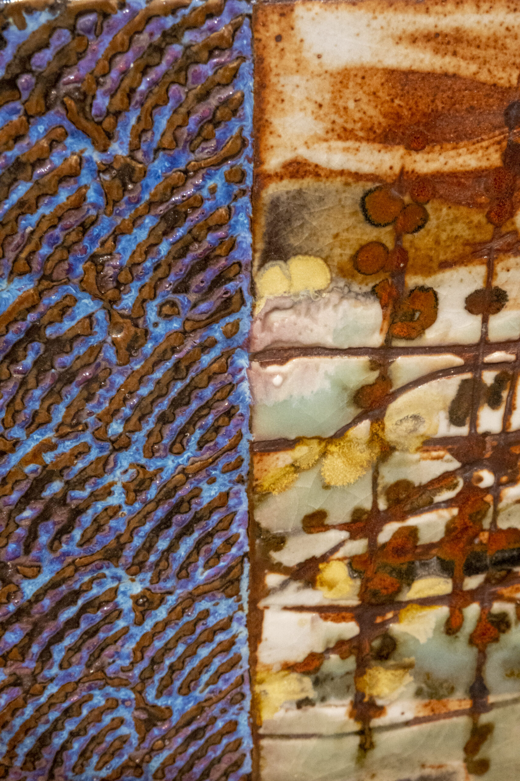 Grès chamotté gravé. Emaux superposés et patine. Décors au pinceau. Réserves à la cire.